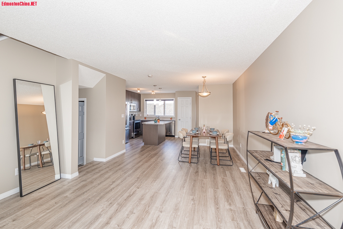 全屋超1200平尺宜居空间,主层配备了宽敞客厅、就餐区,美食厨房中安装了全套不锈钢电器,花岗岩台面熠熠生辉,更有深色橱柜、玻璃瓷砖防溅墙,层压式地板足下生辉。% Y4 K3 u5 {# k) E( d3 O