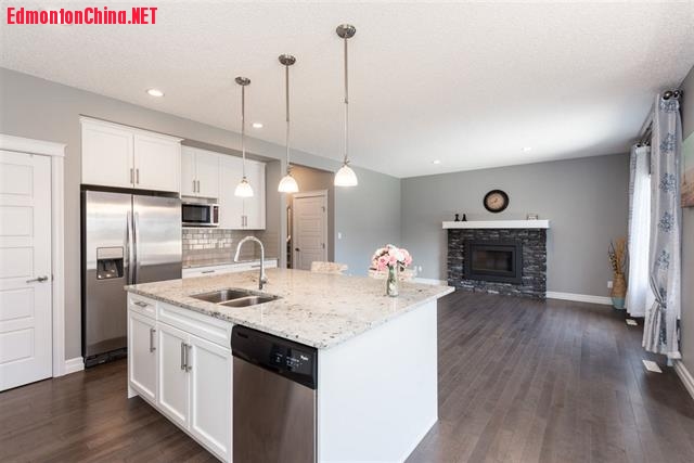 , Z! W `, p0 d2 ^主层坐拥9尺高天花板,硬木地板和地砖艺术配搭,足下生辉!主层设有一卫浴卧室套间!客厅燃气壁炉有石墙装点,雅致温馨!专业美食厨房配备了全套白色时尚橱柜、高端不锈钢电器,超大饭岛设有花岗岩台面,更有角落餐具存储间,便利无双!9 J1 I) x" C. w4 U( }