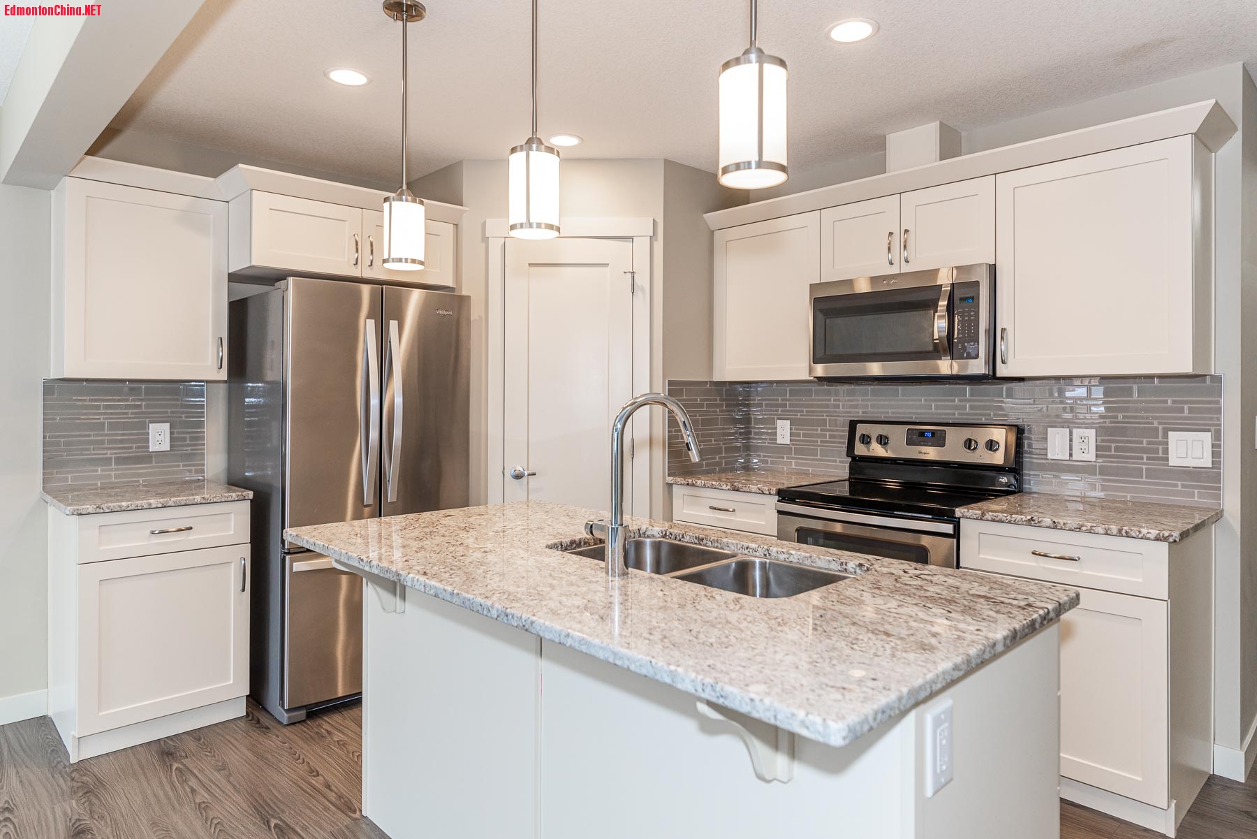 主层开放式设计,铺设了高端层压地板。美食厨房安装了花岗岩台面,时尚瓷砖防溅墙,转角餐具食品存储间,更有带餐吧的饭岛。客厅和就餐区可纵览后院美景!