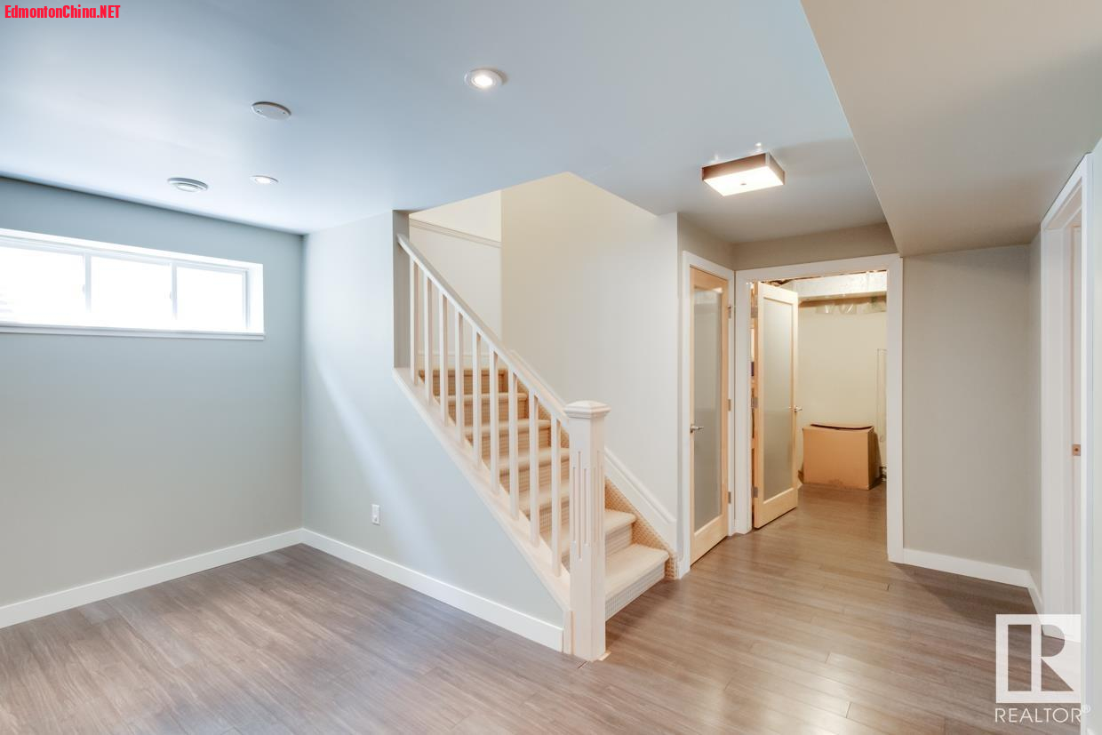 8 N" P, t# q/ r2 V% f& U6 Y拾级而上,二楼超大居家客厅+3间宜居卧室映入眼帘。主卧配备了可步入式衣橱,套房宛若SPA会馆,安装了按摩浴缸和超大独立花洒淋浴房。地下室另有一间、全卫浴间和娱乐室。