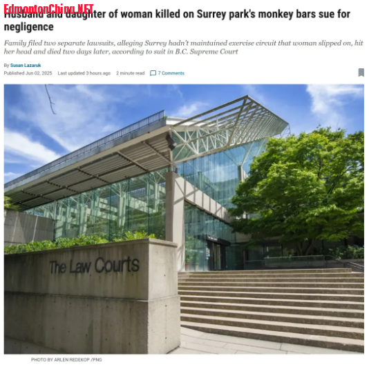 - a* ^) Z5 ?. n. W) ?; F+ e2 Q( E( C近日,这对父女分别向BC省最高法院提起诉讼,将素里市政府告上法庭。他们指控市政府对公园健身设施疏于维护,导致了这起致命事故。